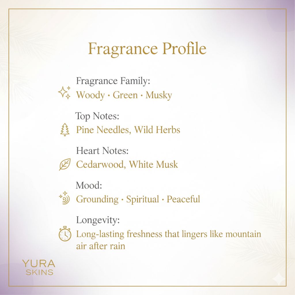 Opening with crisp pine needles and fresh cedarwood, the fragrance settles into the earthy warmth of wild herbs and white musk, creating a balance between rugged nature and soft serenity. Each note tells the story of mist-laced trails, dew on bark, and the peace that comes only from untouched forests.
